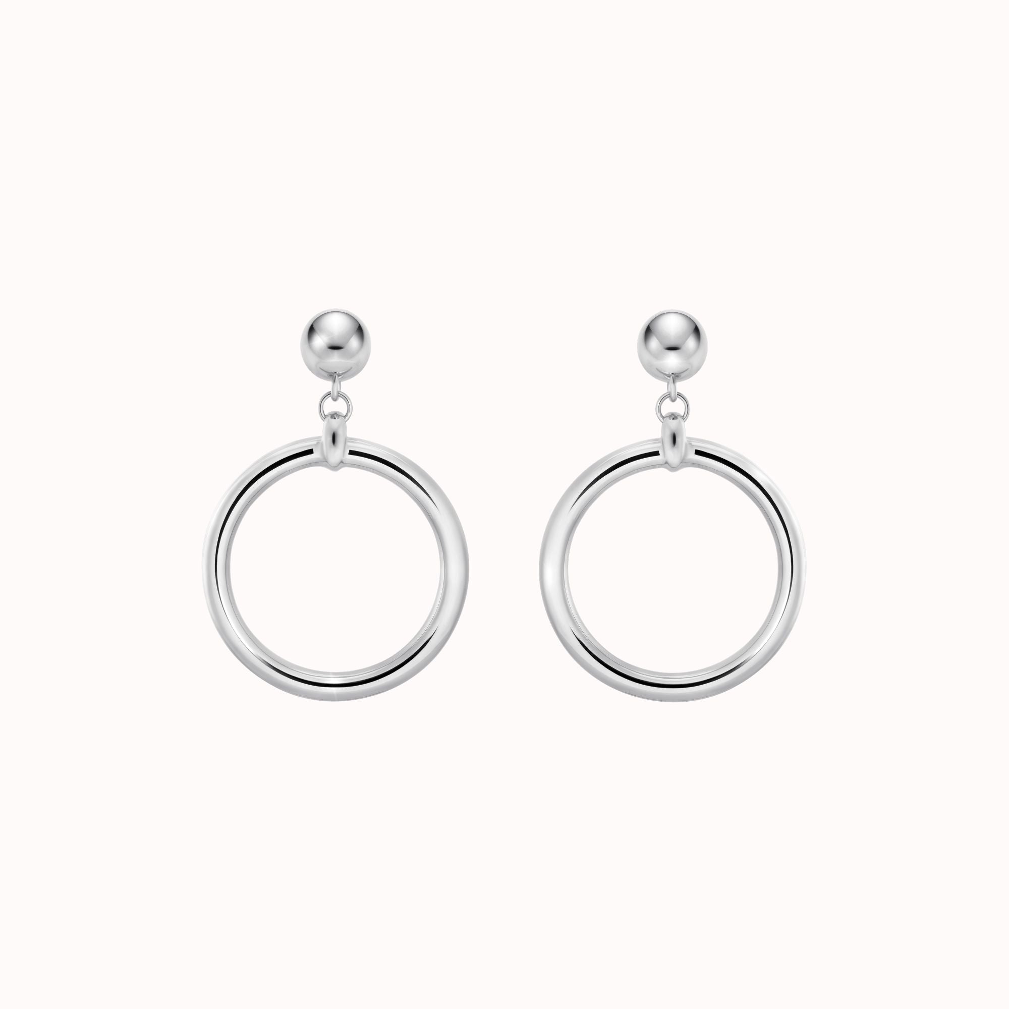 The design features a hollow hoop structure with a central stud, creating a bold yet lightweight profile that remains comfortable throughout the day. With a graceful 4cm drop, the earrings frame the face with understated sophistication—perfect for both everyday elegance and evening occasions.